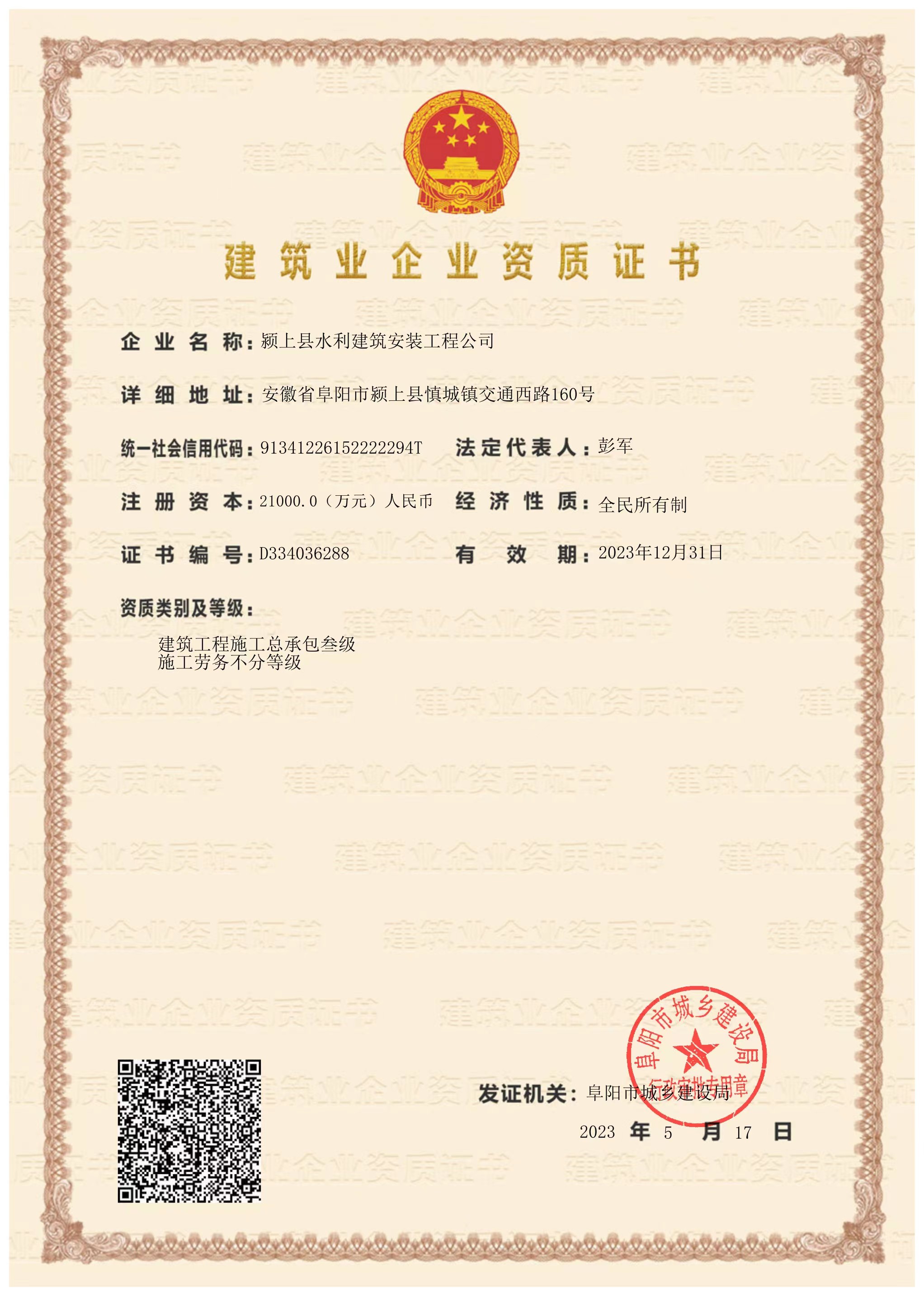 潁上縣水利建筑安裝工程公司成立于1958年,位于安徽省阜陽市潁上縣交通西路160號,全民所有制企業,注冊資金21000萬元,具有水利水電工程施工總承包貳級、建筑工程施工總承包貳級、市政公用工程施工總承包貳級、建筑裝修裝飾工程專業承包壹級資質。       公司現有員工127人,其中黨員22人,高、中級專業技術人員53人,建造師39人,是一個管理先進,技術力量雄厚,工種配套齊全,機械裝備精良,集水利水電工程施工、工業與民用建筑工程施工、室內外裝飾裝潢工